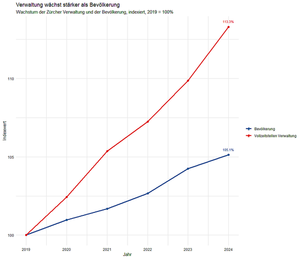Die Zahlen sind eindeutig: Zwischen 2019 und 2024 ist die Bevölkerung im Kanton Zürich um 5,1 Prozent gewachsen. Die Zahl der kantonalen Vollzeitstellen hingegen um satte 13,3 Prozent – also mehr als doppelt so stark. Auch in den Jahren 2025 und 2026 soll die Verwaltung laut Planung des Regierungsrates übermässig wachsen.